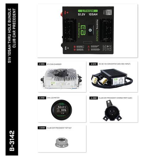 - Eco Battery 51V Lithium Kits: Available in configurations like 60Ah, 72Ah, and 105Ah. Features include quick charging, state-of-charge meters, and compatibility with Club Car Precedent, Tempo, and Onward models. These kits are ideal for users seeking fast installation and enhanced performance.
